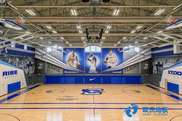 既不能過大也不能過小,所以對于這種木地板都會有摩擦系數的規定,達不到標準是不能滿足體育運動場地使用的。作為籃球場館的體育地板,還要有90%以上的球體反彈能力,歐氏地板籃球木地板檢測地板球反彈能力為91%。實木運動木地板具有良好的反彈力、適當的摩擦力和強大的沖擊吸收力,可以保證運動員在這樣的環境下能夠盡情的發揮。當然,客戶在選擇籃球體育木地板時,要因需求而異,根據自己的環境需求進行選擇,一般籃球場選擇可以單層龍骨結構、主副龍骨結構和雙層龍骨結構。采用懸浮式的安裝系統,保留了地板下架的空間,增加空氣的流通,保證地板不會受潮變形,同時結合專業減震墊的使用,讓體育場地整體有了張力,可以承受劇烈運動的考驗。