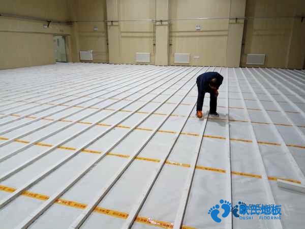 但不能防止木龍骨和空氣中的水分對地板產生的危害,有時也會產生問題。如果木龍骨是經過干燥的,地板的含水率又與使用環境的平衡含水率相近,就不會有問題。因此,在《木質地板鋪裝工程技術規程》CECS2005中可以用此方法。因為工程項目,一次用的實木地板比較多,地板的含水率必須滿足設計要求,在工程設計時就要求地板的含水率應與使用環境的平衡含水率相適應。而在體育木地板生產廠家良莠不齊的情況下,客戶可能都對每一塊地板的含水率進行檢測,這就很難保證不出問題。所以,在新頒布的1標準GB/T木質地板鋪裝、驗收和使用規范中,不允許此方法。將防潮膜鋪在木龍骨上面,這種方法缺點是防潮膜很難抻平,防潮膜在木龍骨上面呈現波浪形。