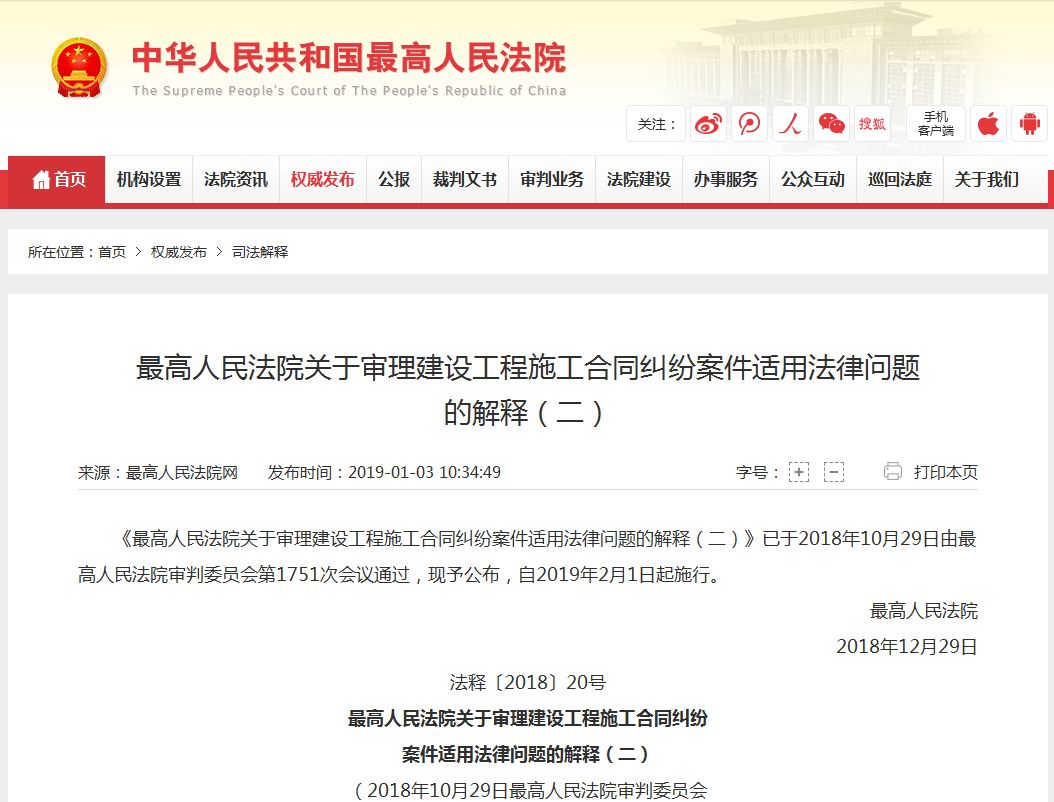 《更高人民法院關(guān)于審理建設(shè)工程施工合同糾紛案件適用法律問題的解釋(二)》已于2018年10月29日由更高人民法院審判委員會第1751次會議通過,現(xiàn)予公布,自2019年2月1日起施行。